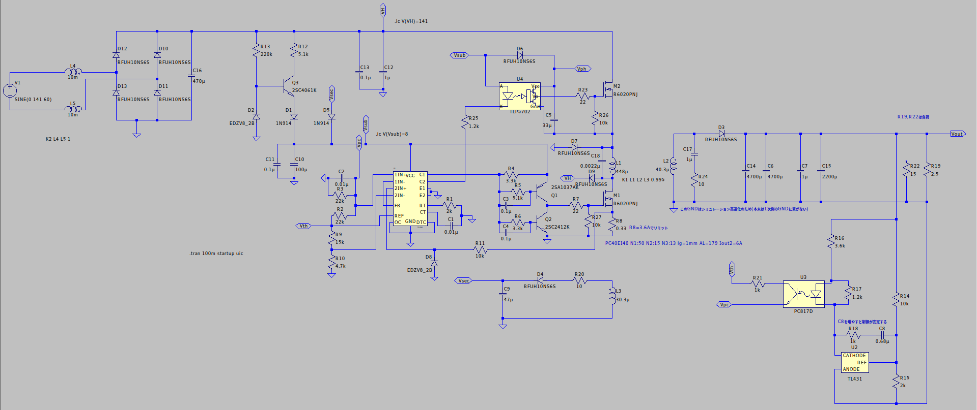 前回の続きになりますが、今回は一次側サージ電圧をうまく抑えて効率を上げた2スイッチ式コンバータをシミュレーションしてみたいと思います。