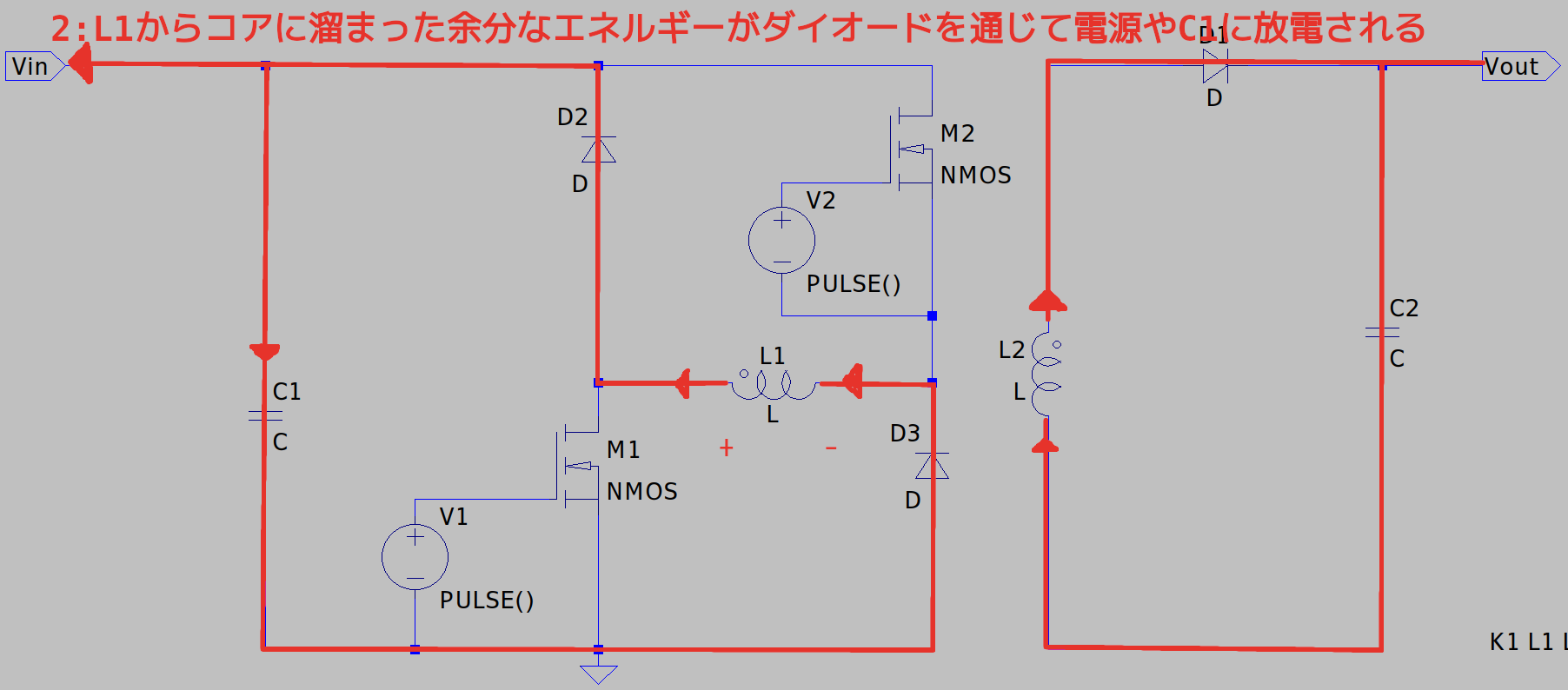 2.二次側の放電と同時に一次側に発生したサージがダイオードを通じて電源側へ帰ります。このときL1が電源電圧にクランプされてサージ電圧が低下します。