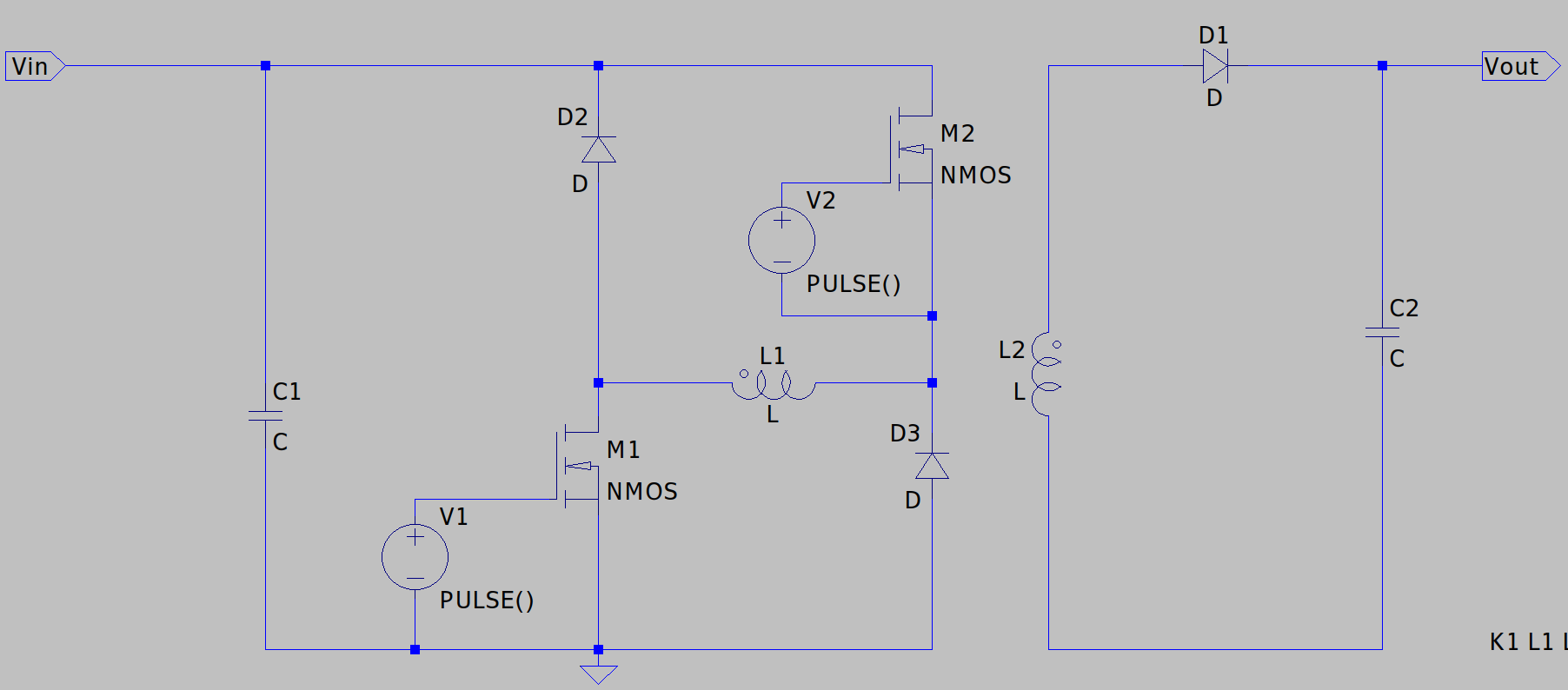 こんな感じで、一次側の+側にもう一つMOSFETを付け加えて、一次側端子から反対側の電源にダイオードでクランプされた回路となります。フルブリッジ回路から2つのMOSFETをダイオードに置き換えた回路と見ることもできます。