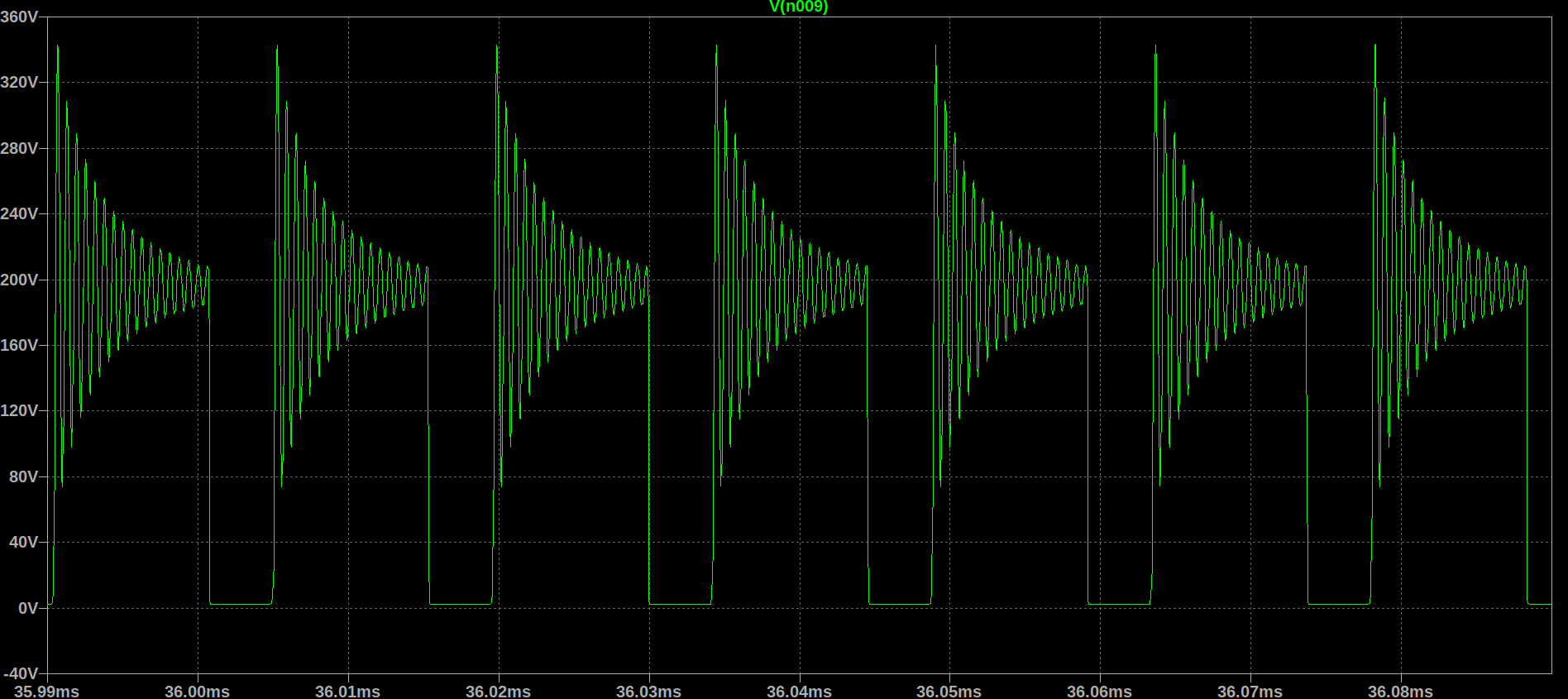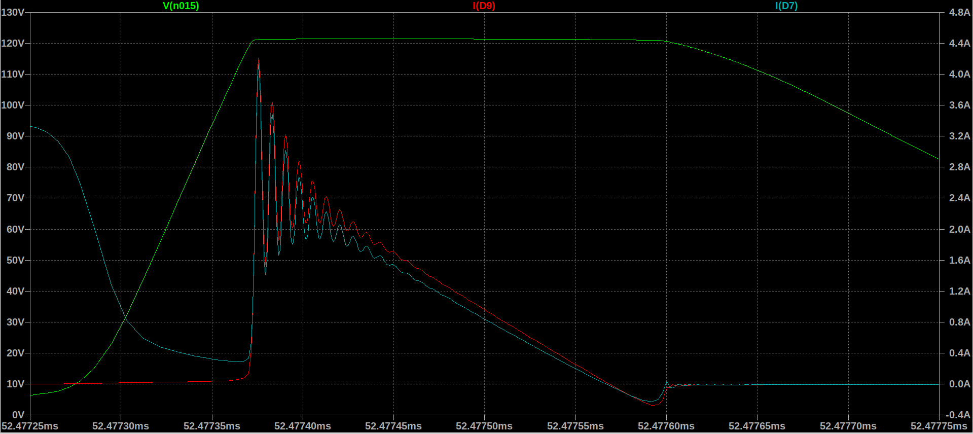 ローサイドM1のMOSFETがオフになってドレイン電圧が上昇したときにD7とD9に三角派に近い電流が流れて、サージが電源に回生されているのがわかります。(それ以前にD9に電流が流れていますがそこは無視してください)