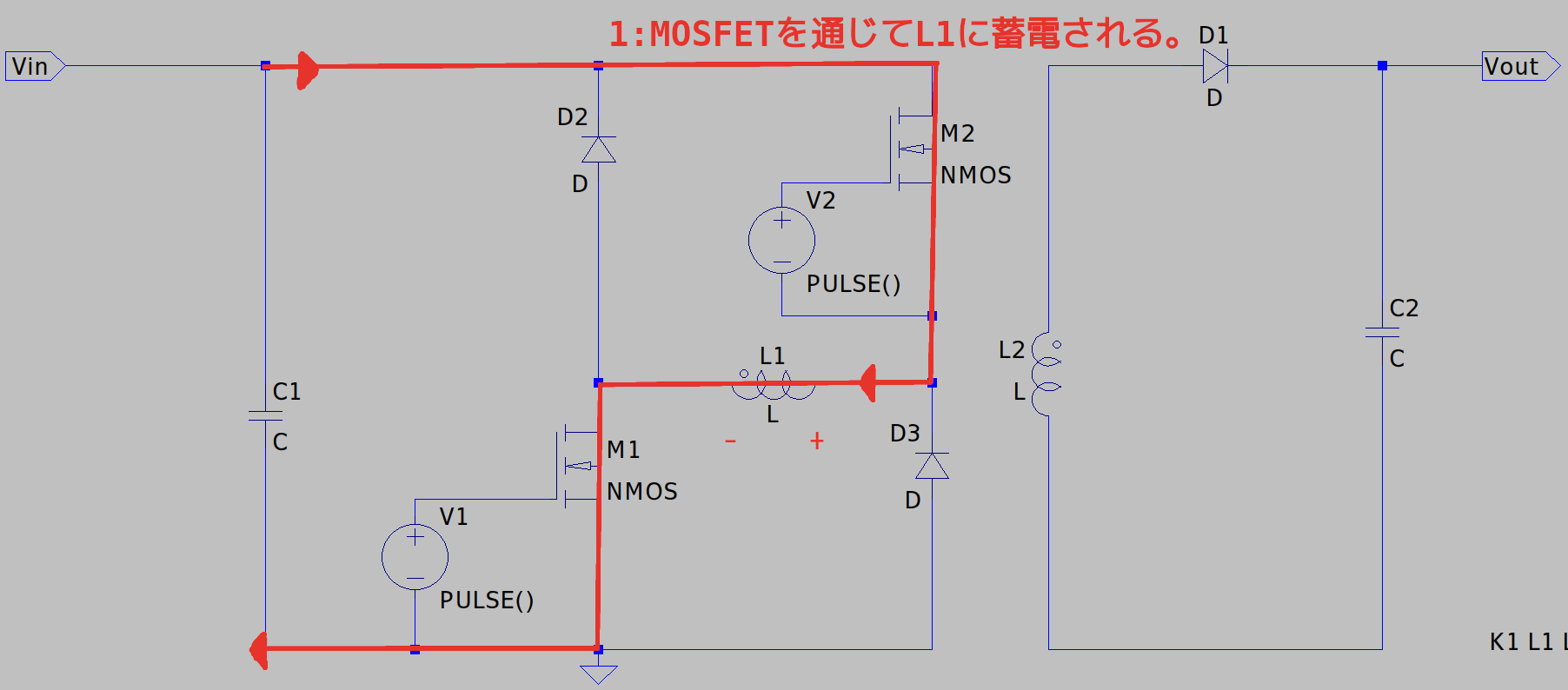 1.電源からMOSFETを通じてトランスコアにエネルギーが蓄えられます。