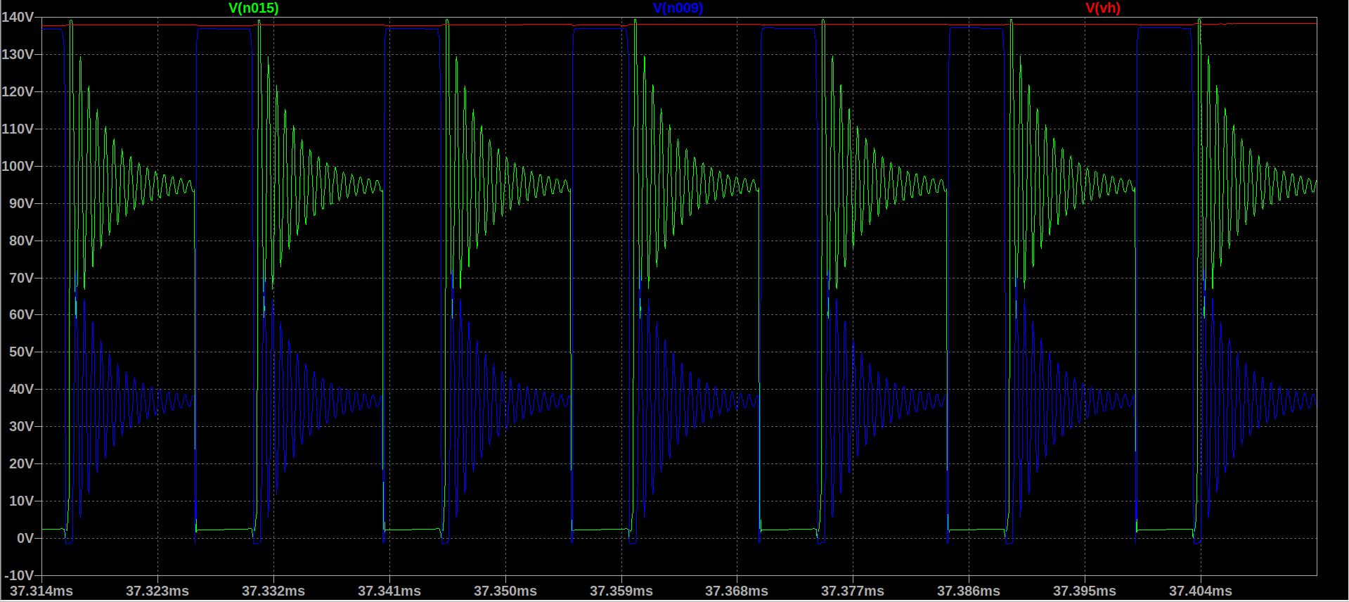 赤のV(vh)が電源電圧で、緑のV(n015)がローサイドのM1ドレイン側,青のV(n009)がハイサイドのM2ソース電圧になります。どちらのFETに発生するサージ電圧の最大値が電源電圧付近で頭打ちになってるのがわかります。