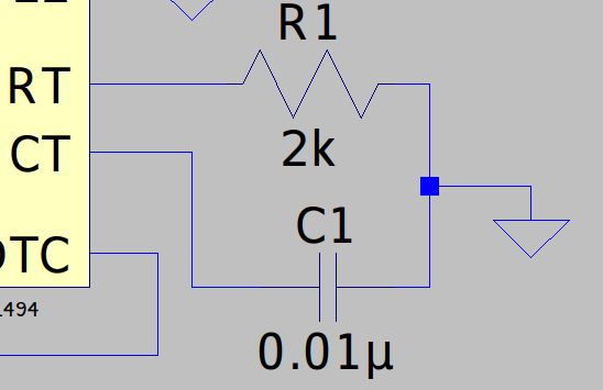 TL494のPWM周波数は6番ピンRTと5番ピンCTで決まります。この周波数は