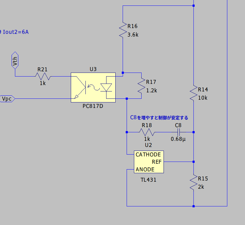 続いてR17ですが、TL431に電流が流れ始めるときに制御が不安定にならないようにするための抵抗です。