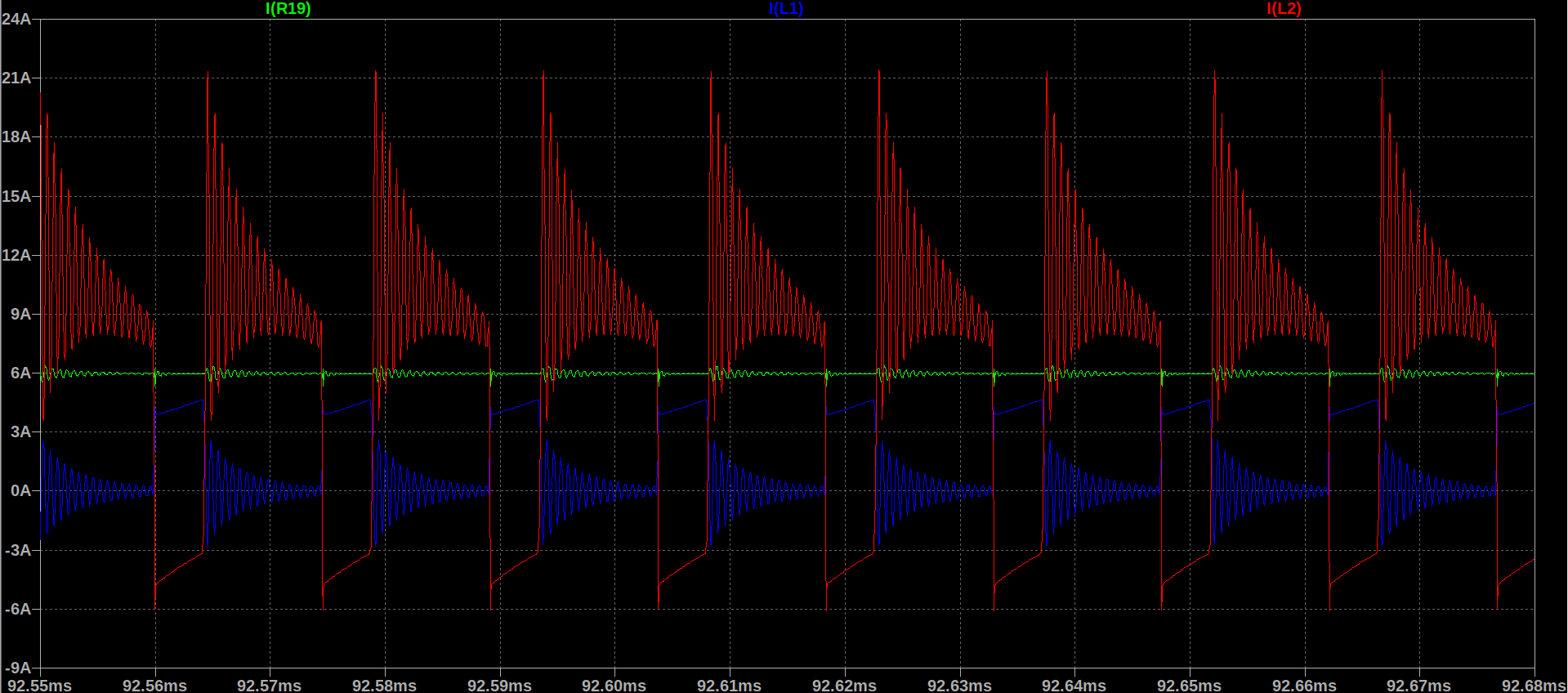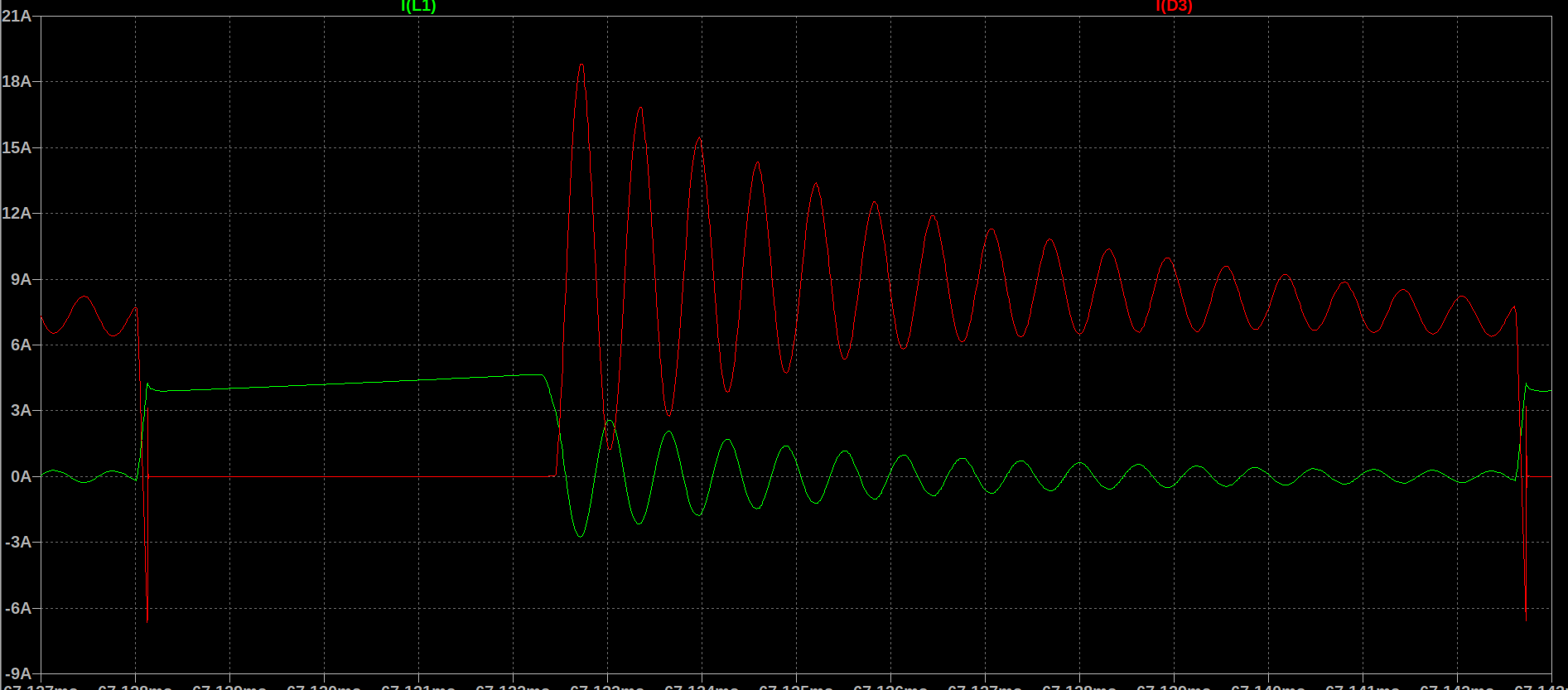 (I(L1)が一次電流,I(D3)が二次電流、共振しちゃった...)