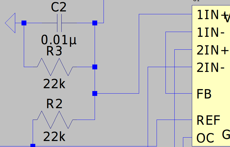 コンバータの出力電圧が決まった値を上回ったとき、フィードバックされてくる信号によりここの電圧が上がりデューティ比が下がります。フィードバック信号がデジタル的なパルス信号なのでそれを平均化して直流に近づけて制御がなめらかになるようにC2を取り付けています。