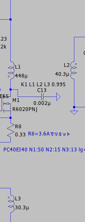 となります。これに漏れインダクタンス成分などによるサージ電圧が重畳されます。C13はそれを抑制しながら共振してソフトスイッチングを行うコンデンサとなります。これらの値からMOSFETの耐圧は余裕や入手性より600Vにしました。