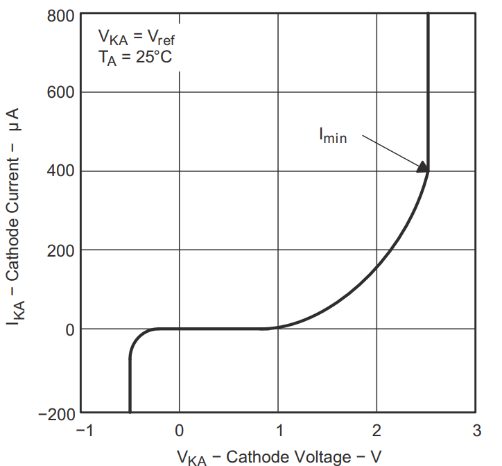 TL431が完全にオンする領域(Iminと書かれた部分以降)までの間に、非線形に電流が流れ始めて400μAまで増加する領域が存在します。この非線形領域でLEDがオンしないようにしています。つまりR17に400μA以上流せば良いです。余裕をもって1mA程度流れるようにしています。PC817のLED順方向電圧が約1.2Vなので1.2kΩになります。