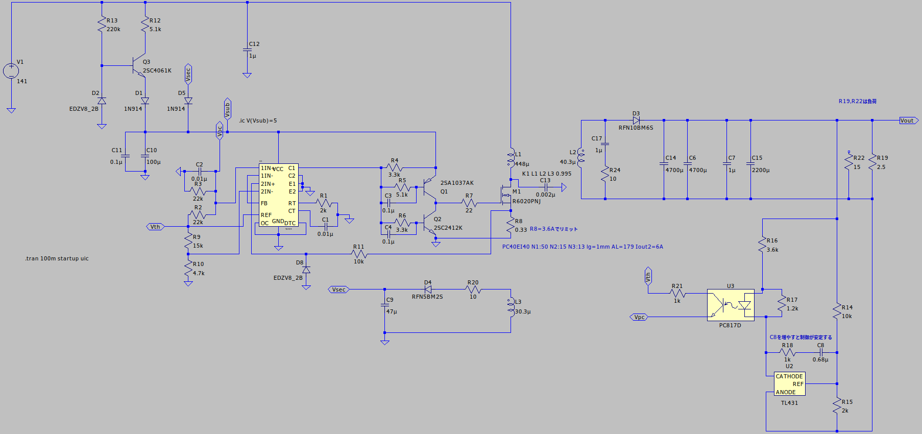 またR18とC8ですが、これが無いと変化の大きなパルス信号がTL494に伝わってPWMのデューティ比が激しく変化し、出力電圧が不安定だったり大きなノイズが発生します。そのためTL494にフィードバックするフォトカプラの応答を遅くするために設置しています。そして前述のC2でさらに変化を遅くして滑らかな制御ができるようにします。シミュレーションで確かめながら値を探ってみてください。