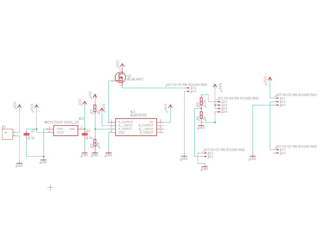 またlipoバッテリーに保護回路が内蔵されているらしいですが、電圧が一定以下だったらESP側に通電しないように分圧回路とコンパレータで追加で回路を組んでいます。