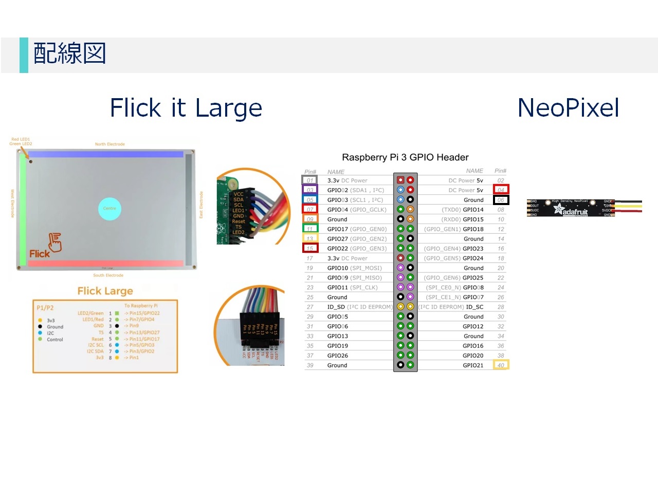 2.配線図を元に、ラズパイに、Flick! Large、NeoPixelを接続します。
