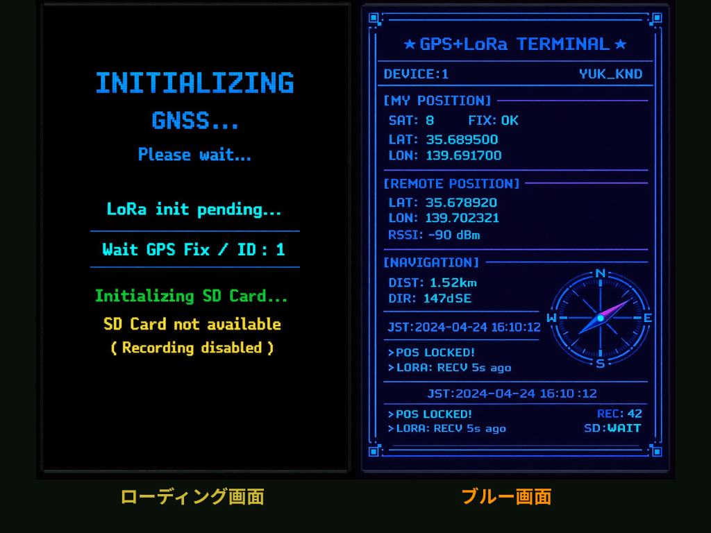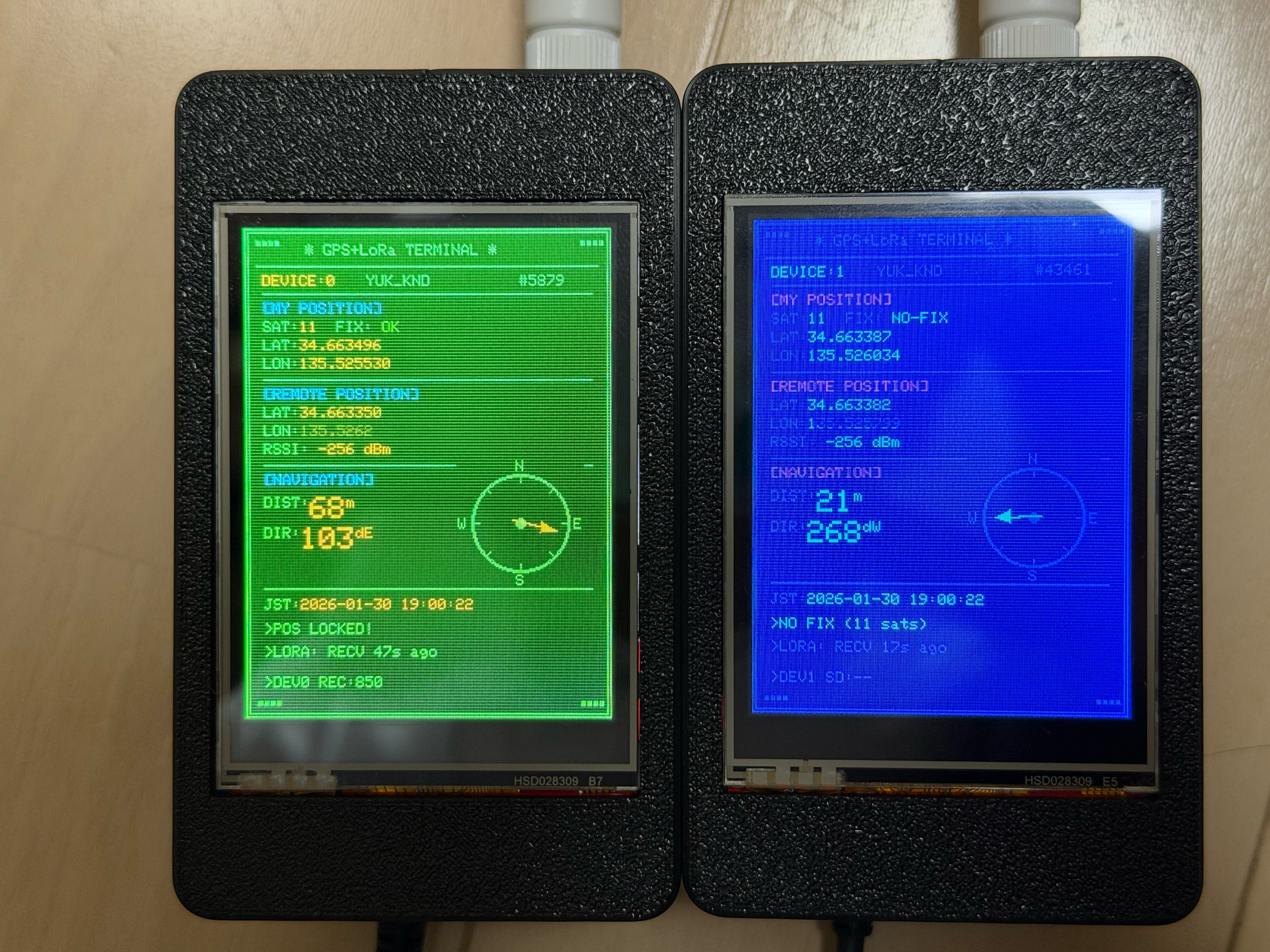 - LoRa通信: 2台のデバイス間で位置情報を送受信