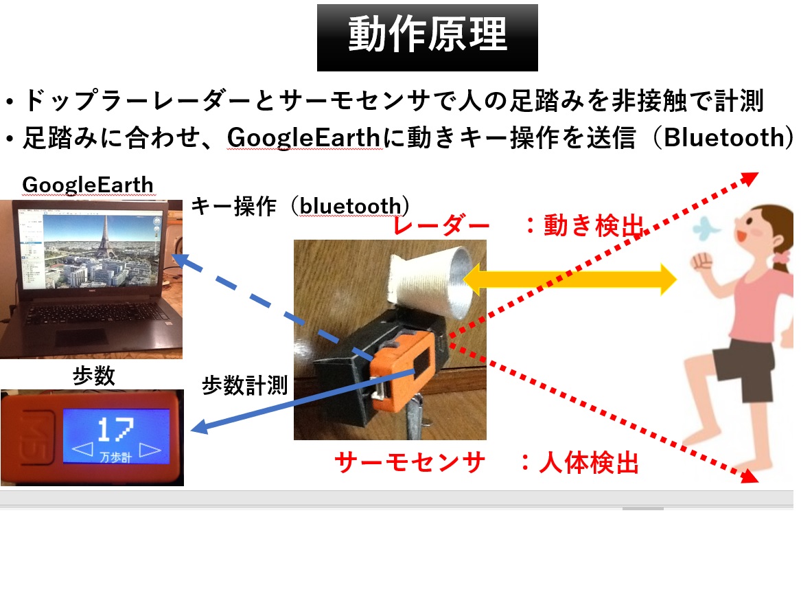 Doppler Radar(RCWL_0516) と Thermopilearray(AMG8833)を使い、人の足踏みの動きを非接触で計測し歩数表示する万歩計、及び動きに同期してGoogleEarthProの映像を移動するキーコードを送信(bluetooth)し足踏みしながら世界を観光。部屋の中で世界観光しながら歩数を見て有酸素運動が出来る ジェスチャー入力GoogleEarthコントローラーを作った。