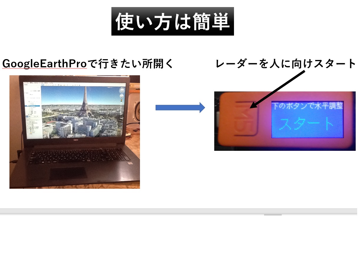 DopplerRadar Thermal pile arrayにより歩行速度 向きを非接触でセンスし M5stickCでGoogleEarthキー操作に変換しBluetoothで送信し あたかもGoogleEarthの映像の中を歩行するように見せる