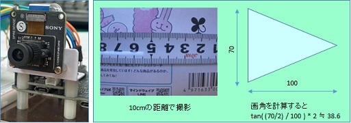 - メーター前面に10cmくらいの距離で設置したいので、その位置でピントが最適となるように再調整しました。下図はこのときの画角を調べたもの、約39度でした(下図右)。
