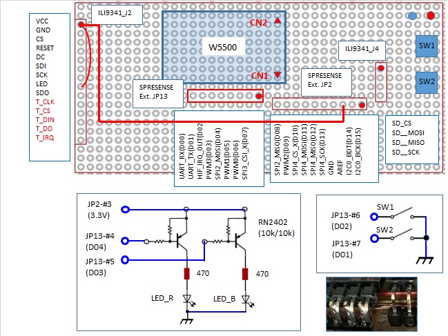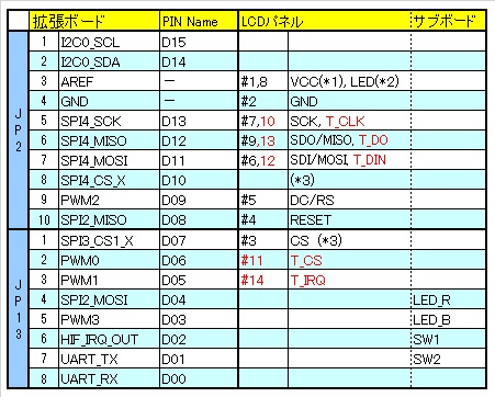 - (*3) LCDパネルのCSピンはdefaultピンではなく JP13-#1(D07) に接続しIO制御としています。 (W5500-etherを拡張ボード側(SPI4)に接続する予定だったため)