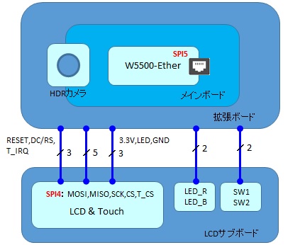 W5500-EtherをSPI4で使用したかった理由は、メインボードに装着するとRJ45コネクタが邪魔で、カメラを拡張ボードに固定することができないためです。LCDサブボードに搭載しSPI4接続として、ジャンパーワイヤーもなくすっきりできるつもりでした。