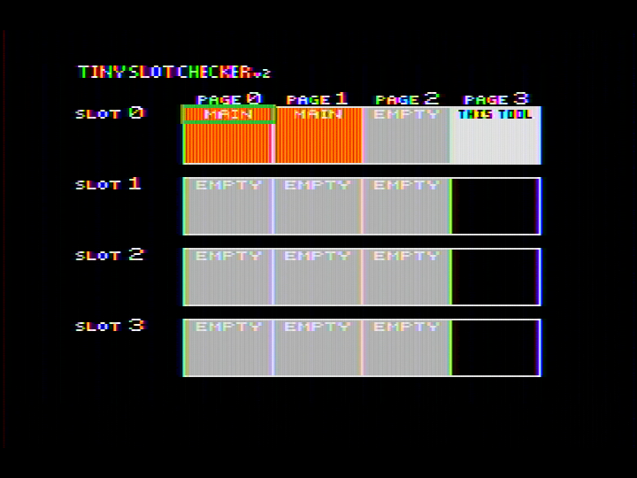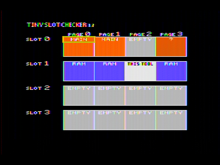 TINY SLOT CHECKER も (RAM32KB以上を要求する) RAM版が動作し、以下の結果になった。