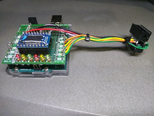 PICマイコンとICソケットの間に挟み込んで、各端子の信号の状態を読み取り Arduino のシリアルに出力します。