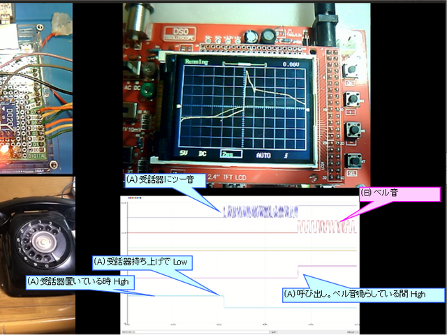 音声回路とベル駆動につながっている2端子はアナログ端子として analogRead() で読み取ります。