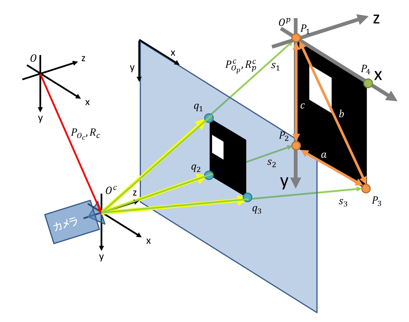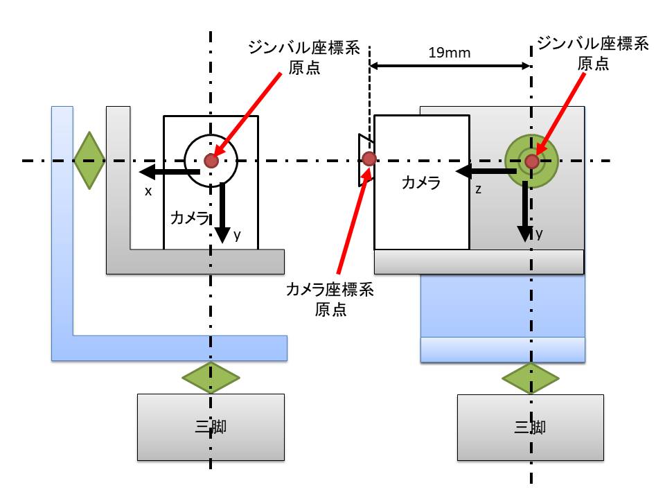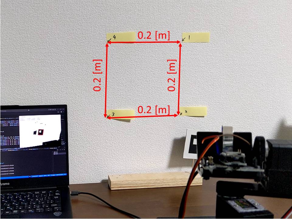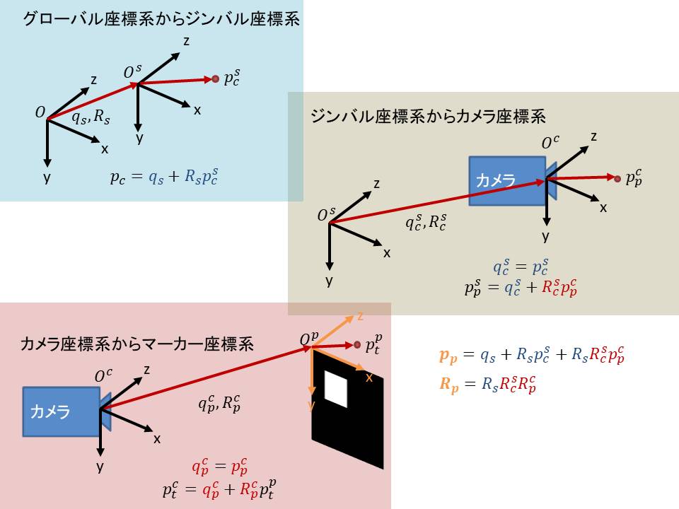マーカー頂点の実寸法とカメラパラメーターを使用して、Perspective 3 Point 問題を解くことでカメラを原点としたマーカーの位置、姿勢を計算する。 - ジンバル