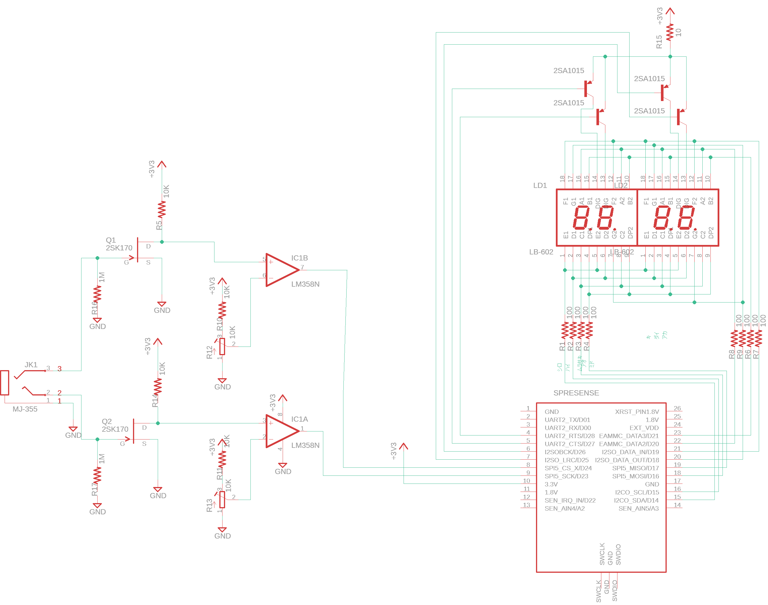 最終的に苦肉の策として3.3Vとエミッタの間に10Ωの抵抗をいれて、数字の点灯ができるようになりました。メインボードだけで、正式な点灯方式がわかれば、改善していきたいと思います。 - 打撃音検出部