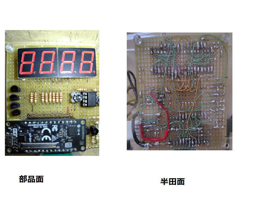 半田面配線は、2桁7セグメントLEDの桁間の端子の接続と2桁7セグメントLED間の接続があったため、配線が入り乱れ、拙い電子工作の極みですが、桁ごとにきちんと表示はしています。