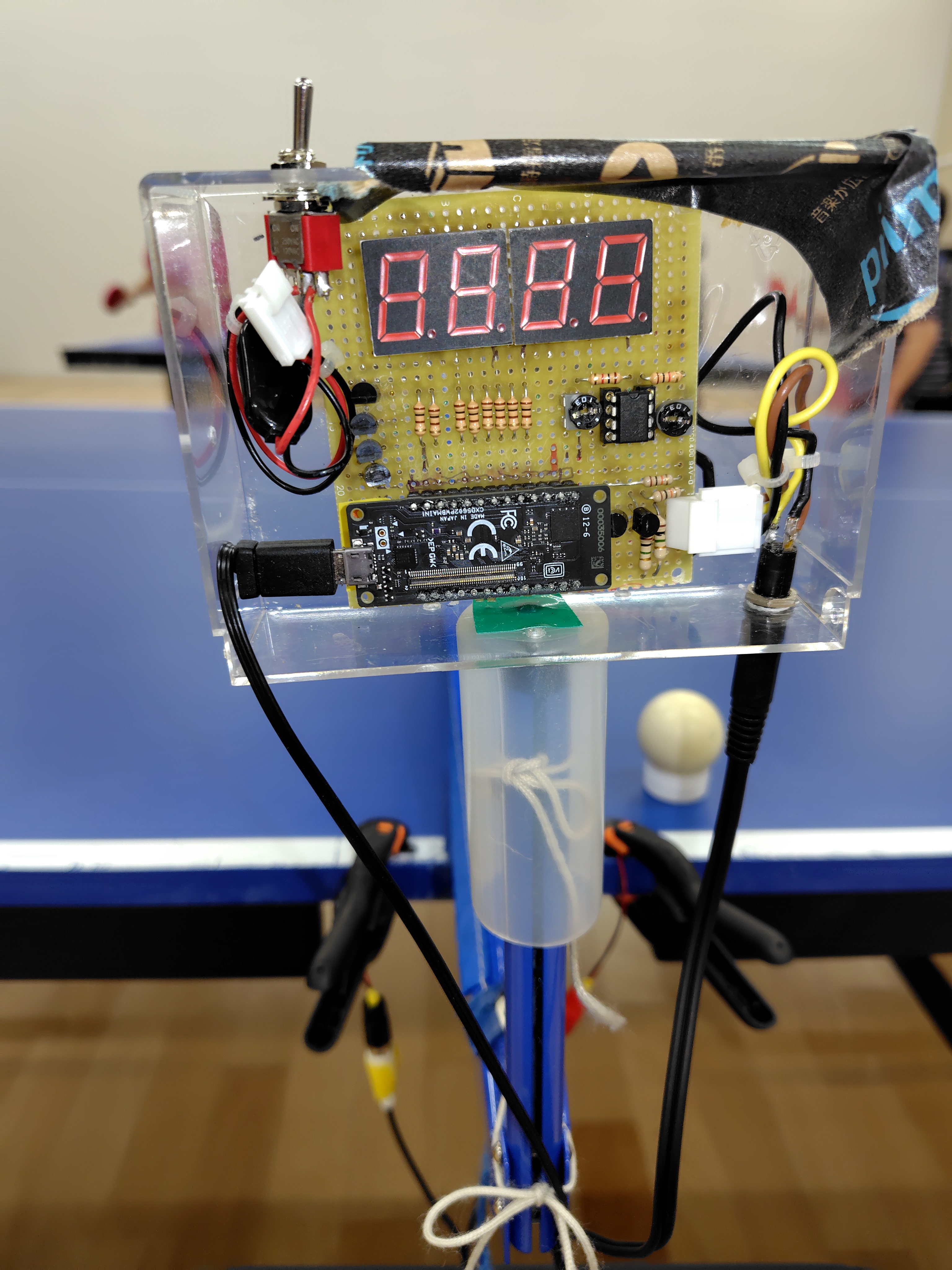 短い動画ですが、添付します。卓球台に設置している状況と治具で左右のパルスを出して表示したものです。治具での表示は、カウント100回で、ハイフォン表示になり、また、1からカウントします。治具の動画は、画面が横になっていますが、ご了承ください。