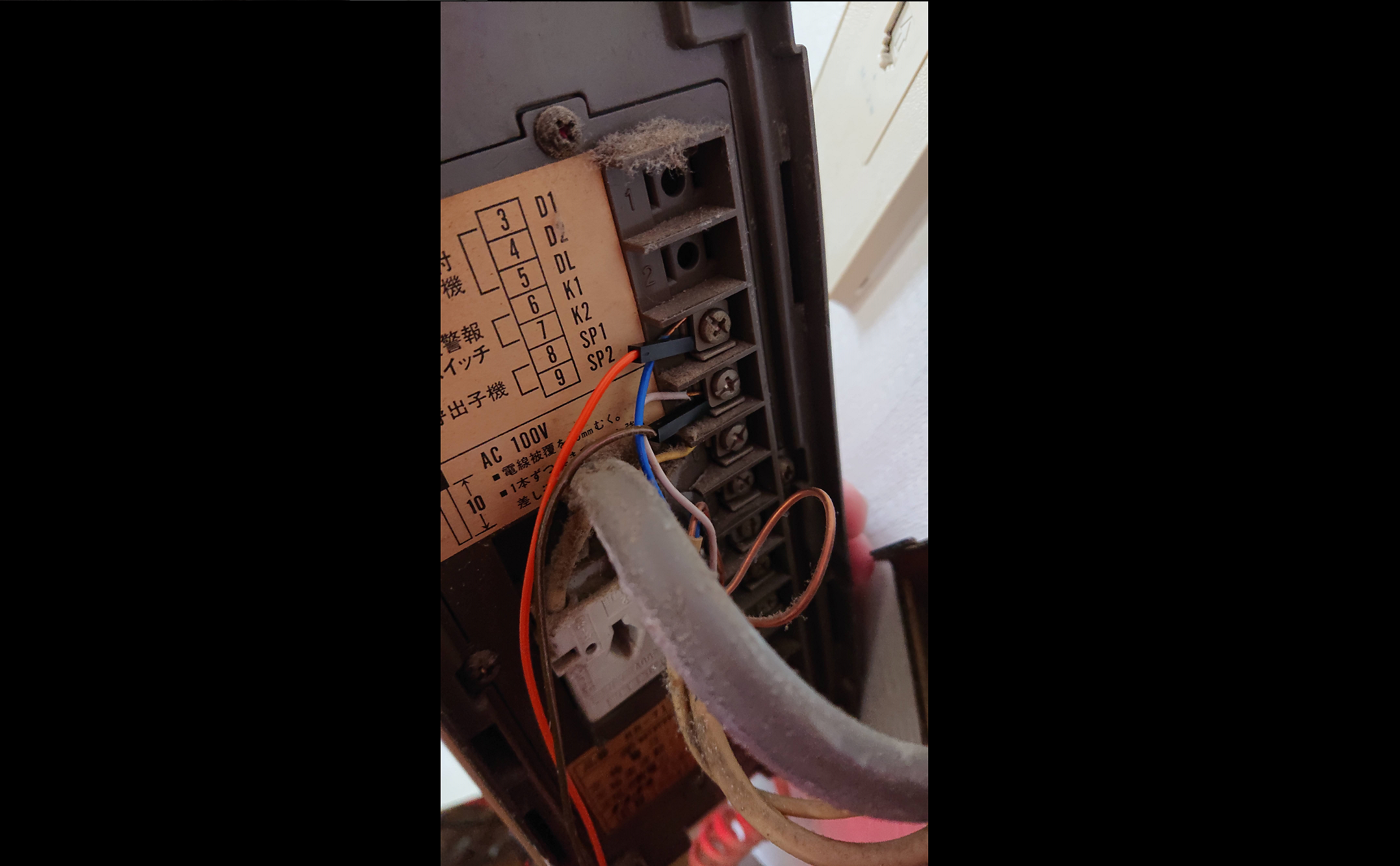 インターホンをあけると配線が見えます。仕様は各家庭で様々と思いますので、説明書をご確認ください。
