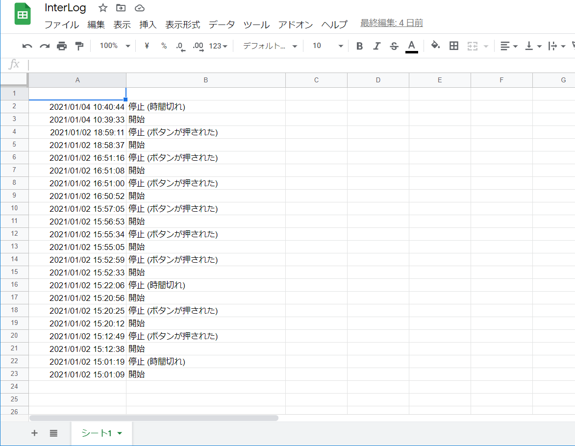 Googleスプレッドシートには以下のようなログが保存されます。