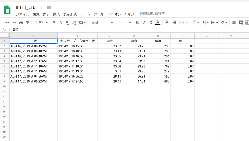 LTE-Mリーフの電源をONにして、IFTTTと通信させ、Googleスプレッドシートにセンサ情報が表示されているか確認します。