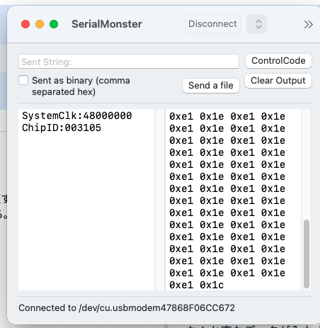 実際に8MHz、24MHzおよび48MHzに変更してみたが普通に動いた。ただし、24/48MHzの場合はwhile(1)ループ中になんか変なデータが入力されるようで、大量なゴミデータが出続ける。
