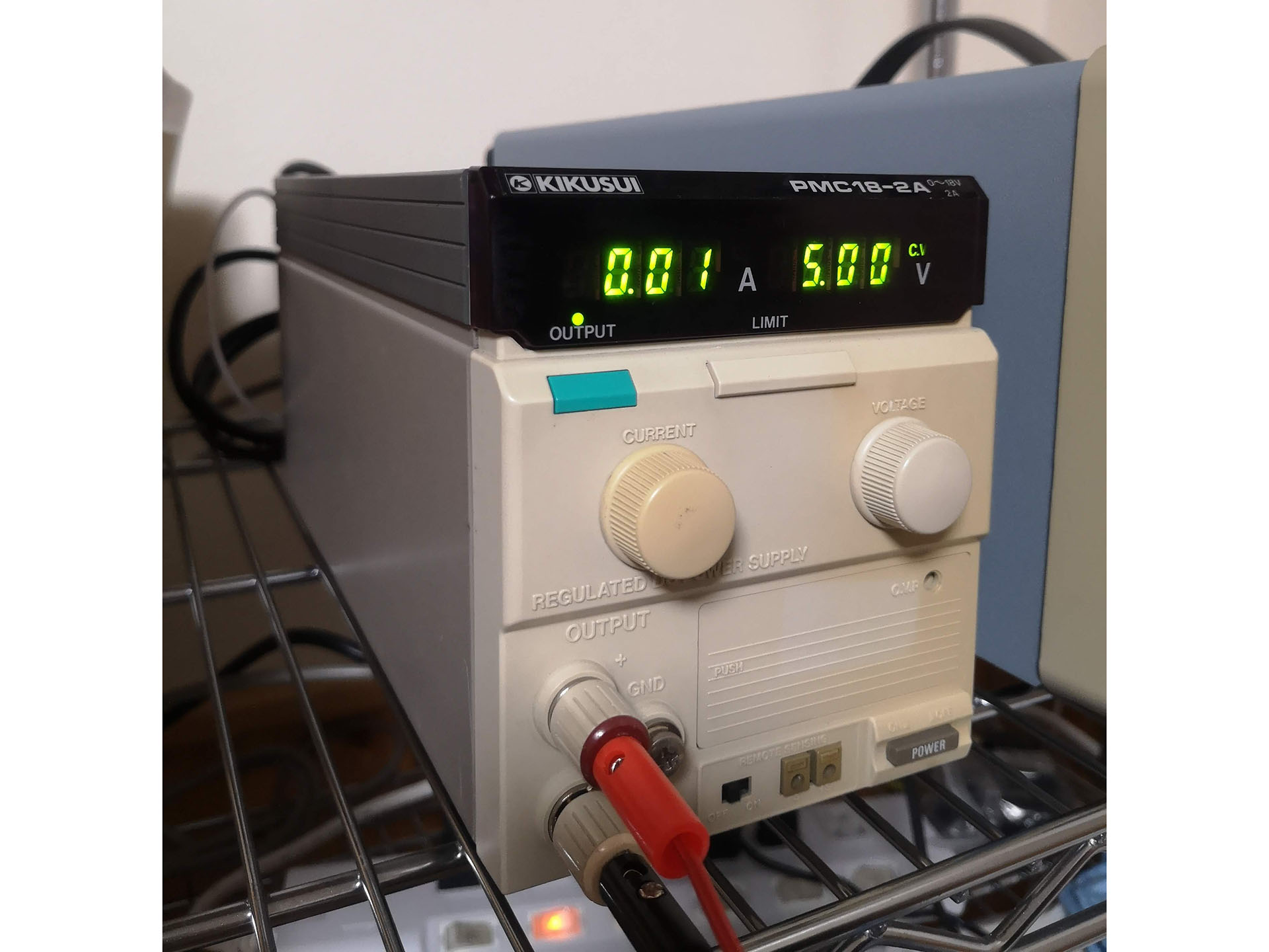 筆者はヤフオクで買った KIKUSUI(菊水) PMC18-2A を使っています。とてもシンプルな機能の電源装置ですが、定電圧駆動、定電流駆動のどちらも設定できるため、いろいろな実験が可能です。