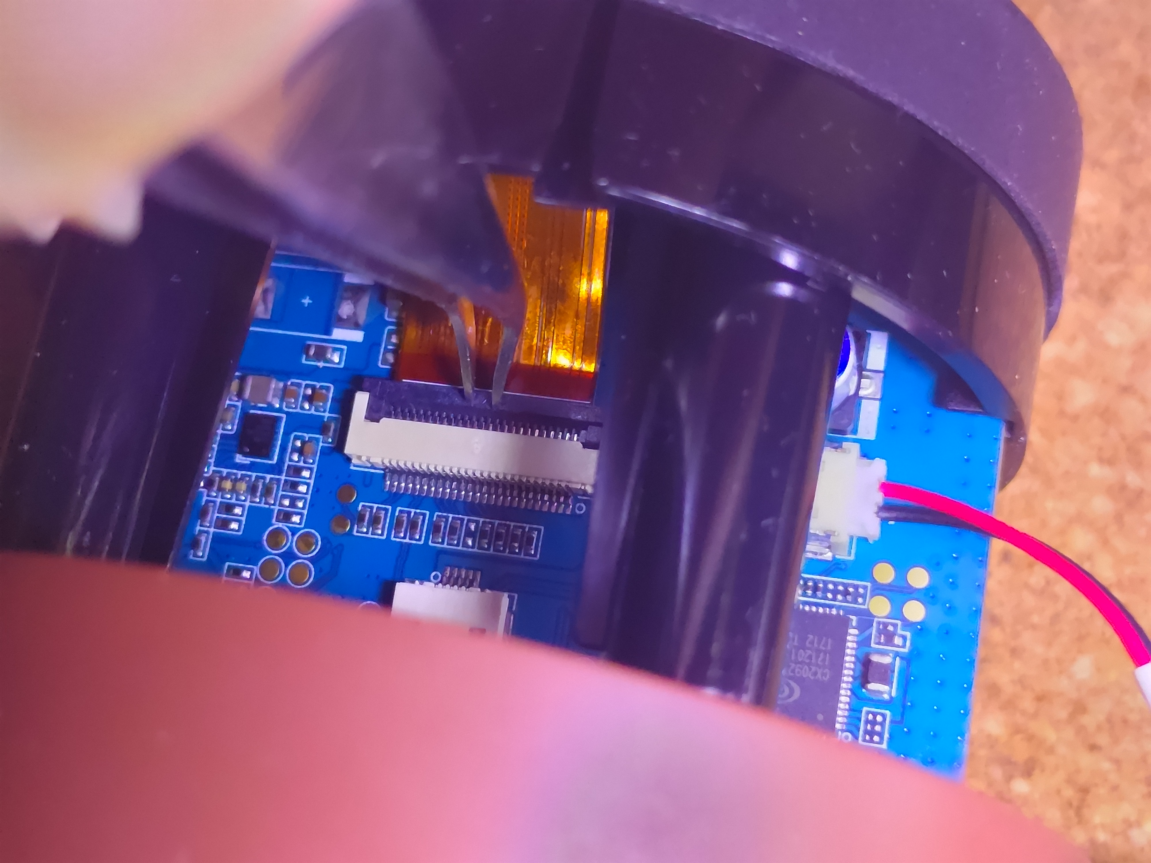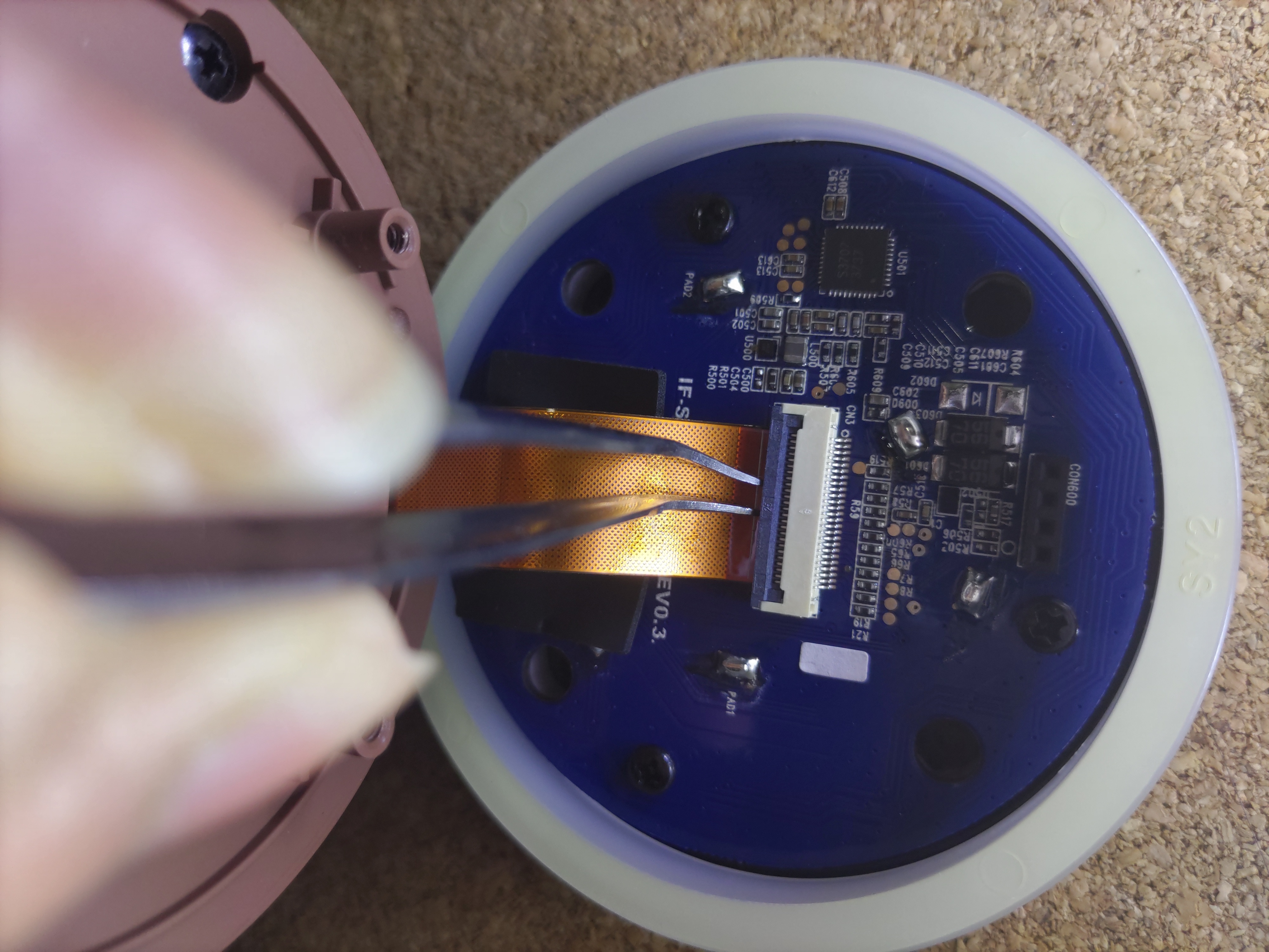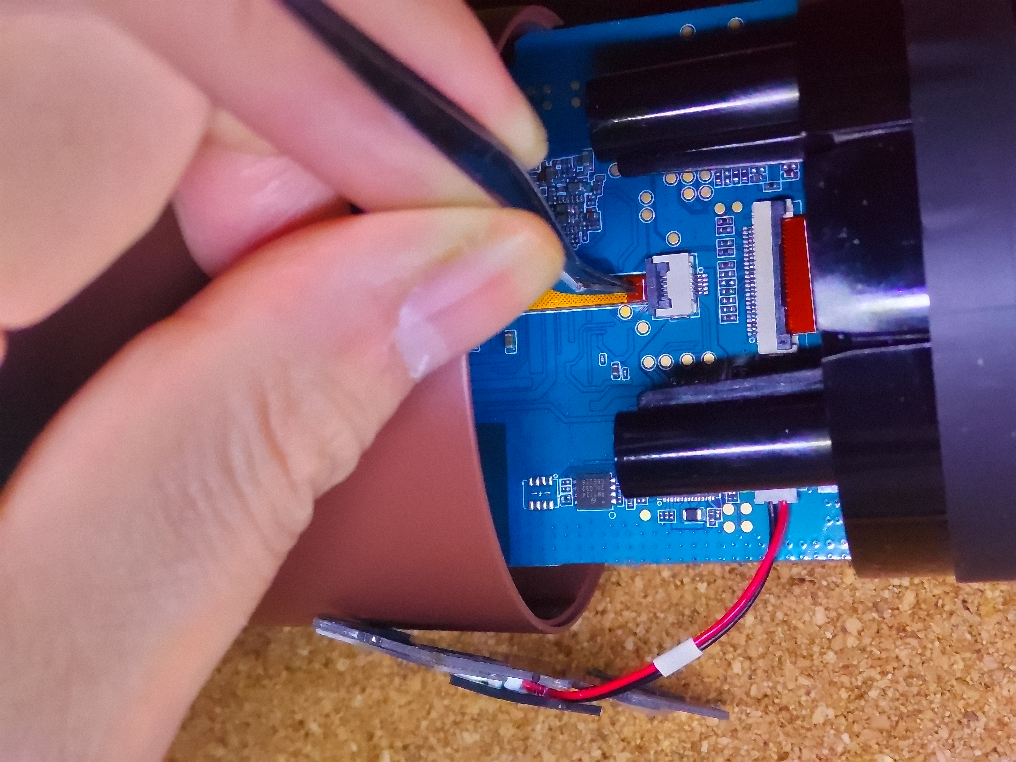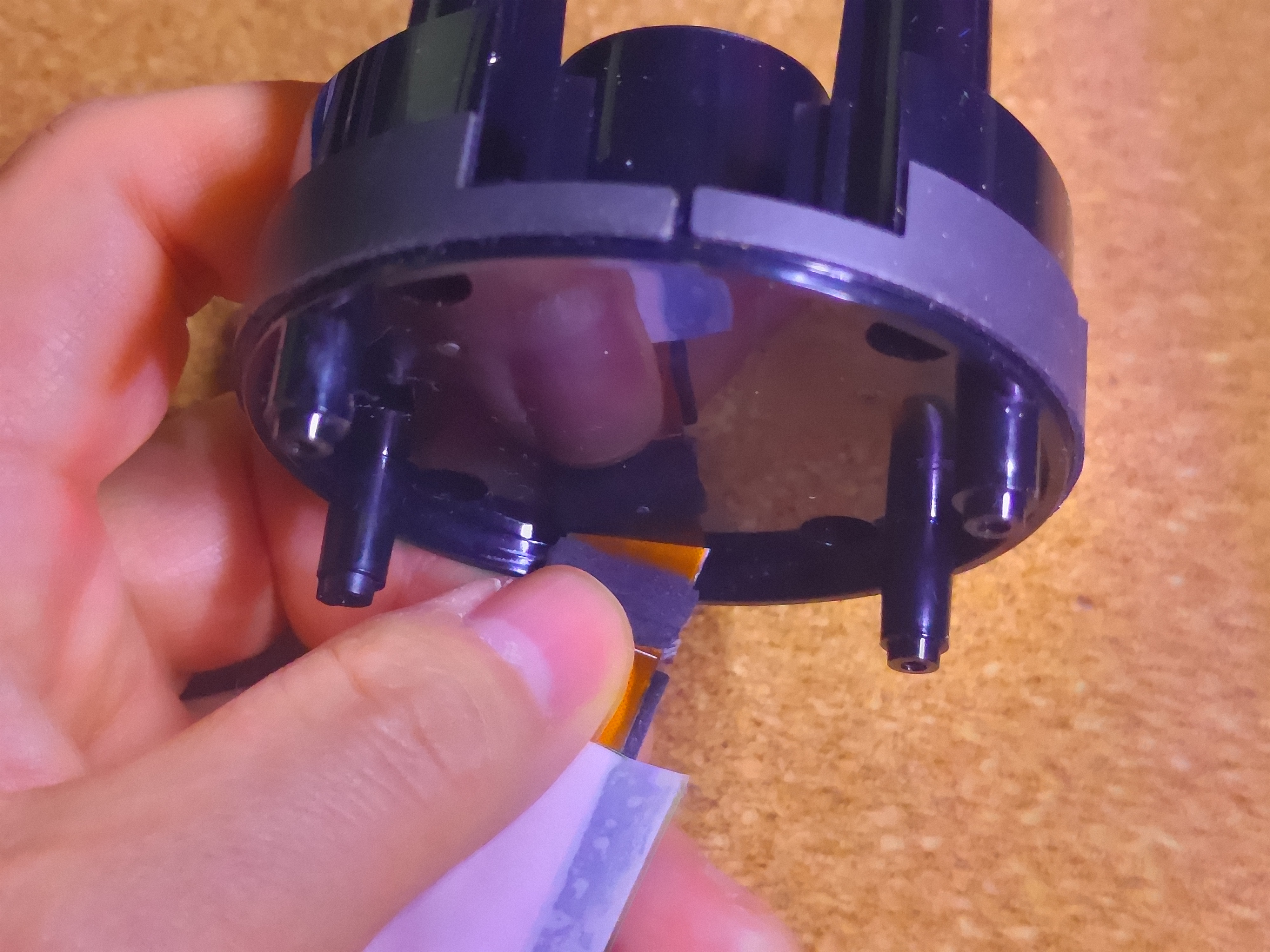 底面の中央部にフラットケーブルが接続されているので、シールを剥がしてから外します。