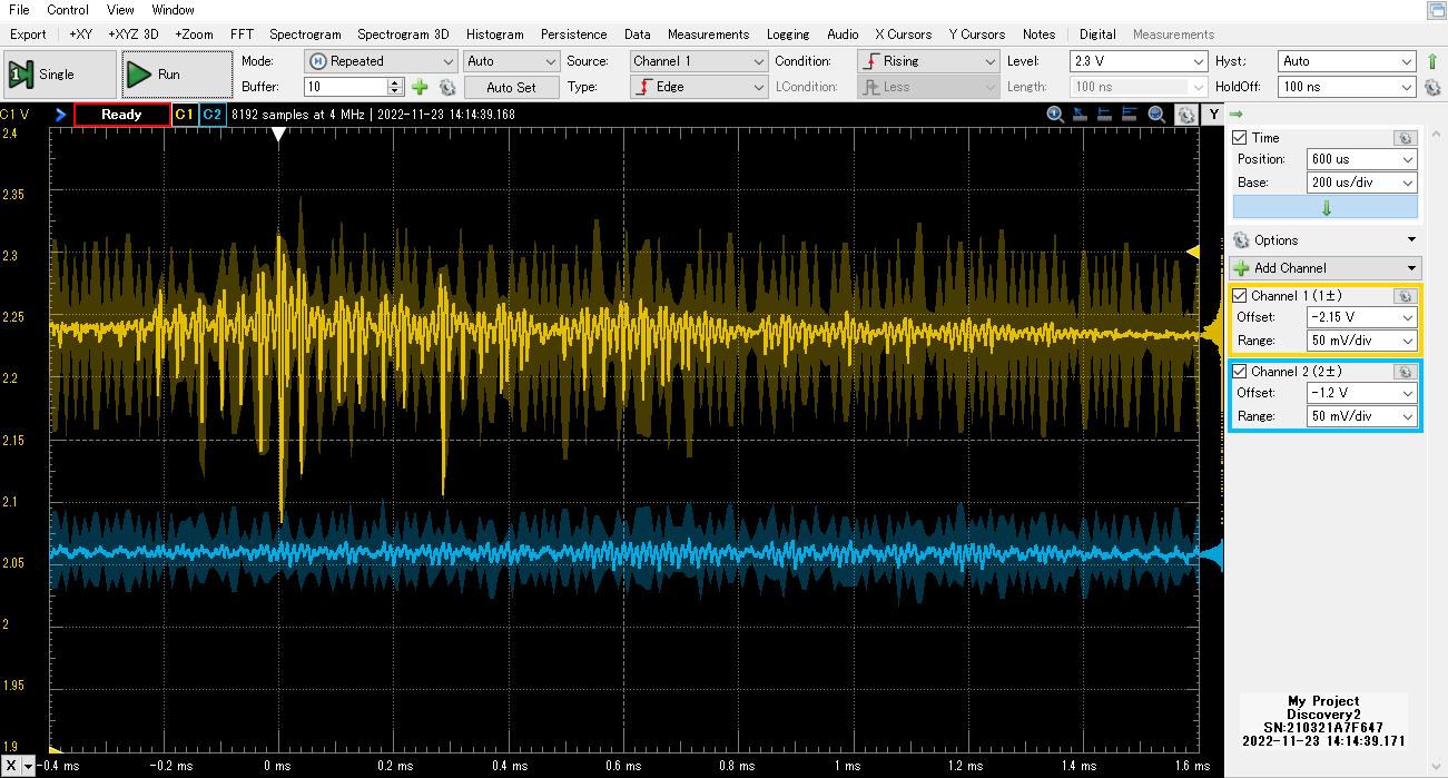 基板からどんなデータが出ているかをオシロスコープで調べてみたところ、以下のとおり単純に音声のアナログ信号が出ていました。