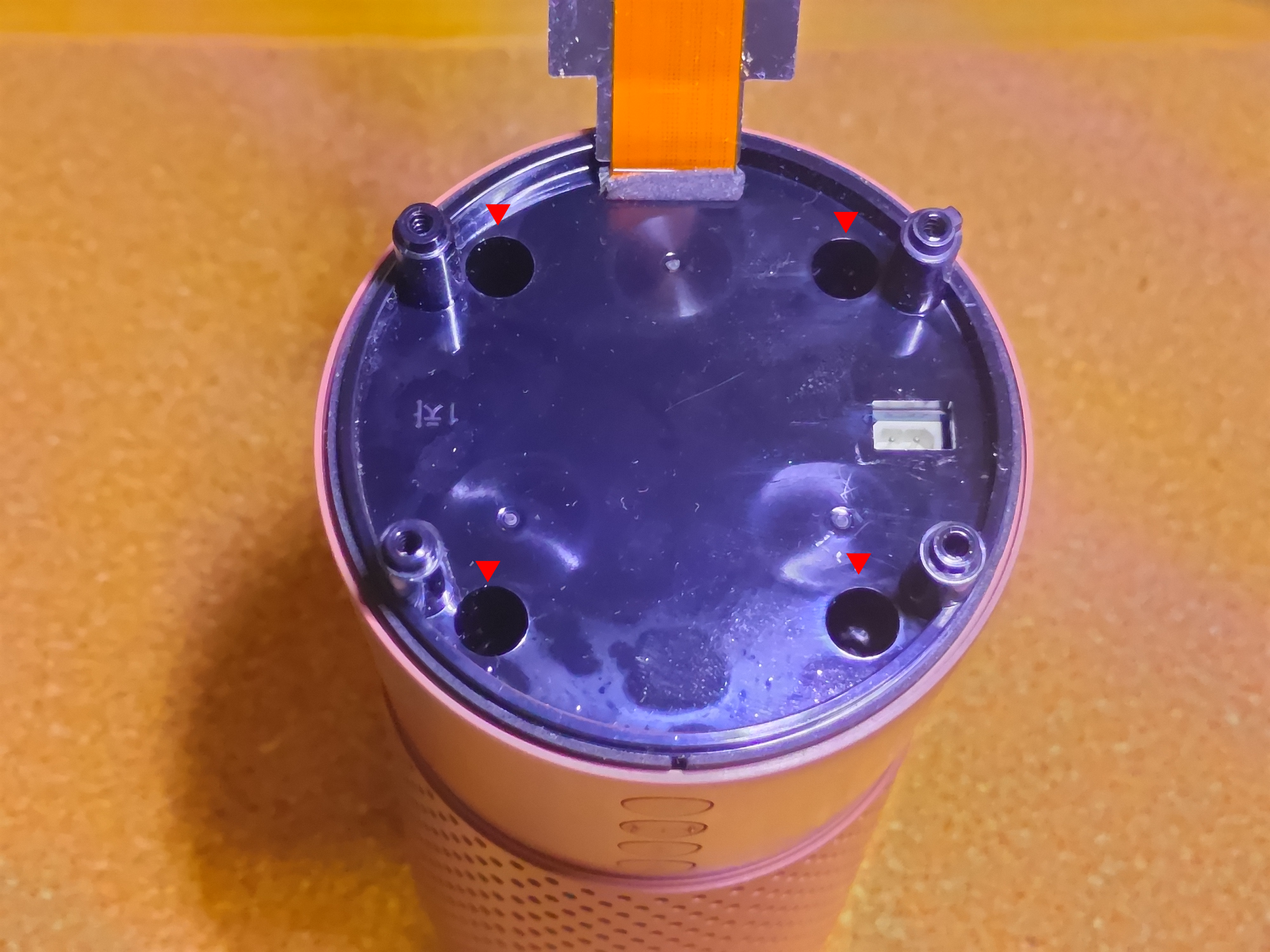 写真の赤▼のネジ位置2か所外して基板をとります。