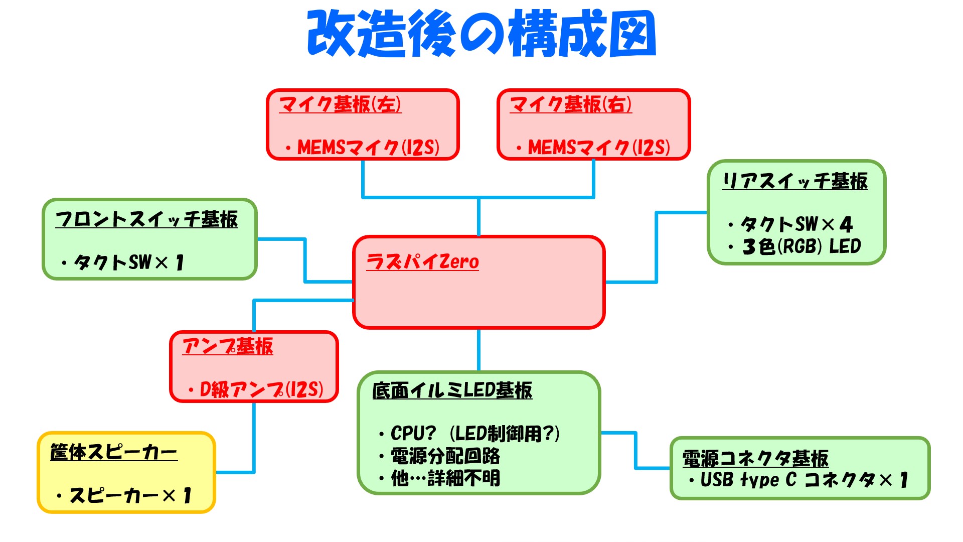 - 肝心要のスマートスピーカーとして基本となる会話する機能ですが、AIYキットという製品がラズパイ Zero を使って、Google Assistant 機能で声で話しかけて音声で応答するという事が出来ていましたので、それをベースに検証してみたところできました。