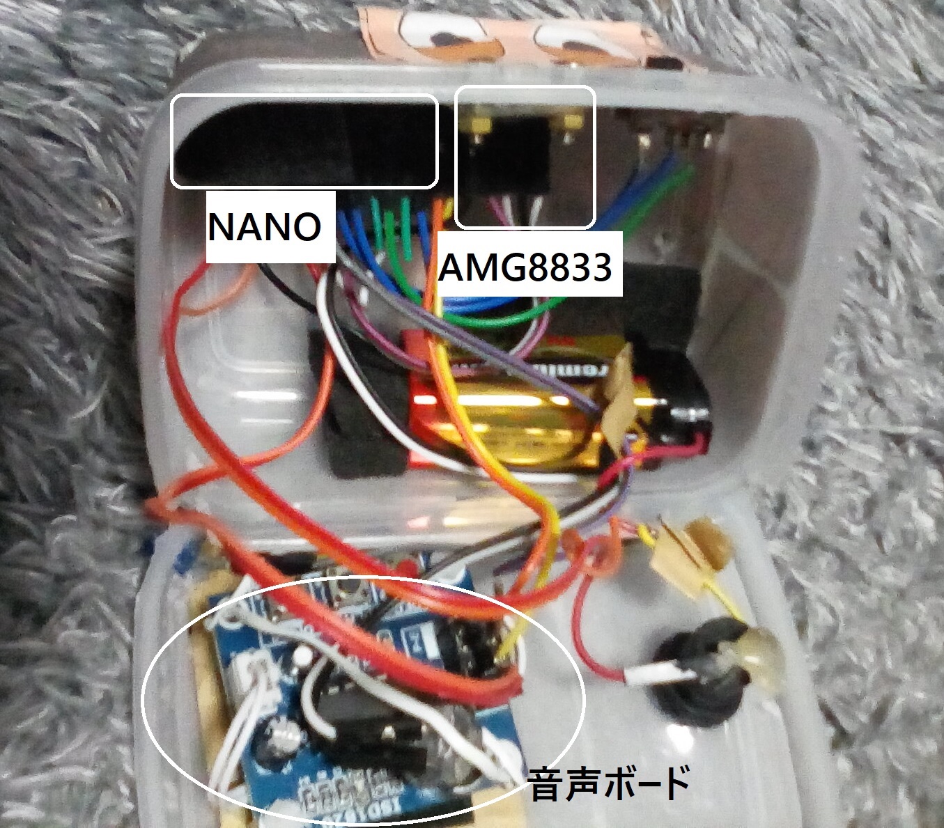 ① 子供の接近を検知する方法として、超音波距離計があるがテレビの近くに物があったり部屋で反響したりして誤動作が多い。シャープ赤外距離計は1mくらいまでが限度で視野角も狭い。サーモグラフが安定していた。ただし距離を測るデバイスでなく体温の占める面積でおよその距離とした。(面積多い=近距離)