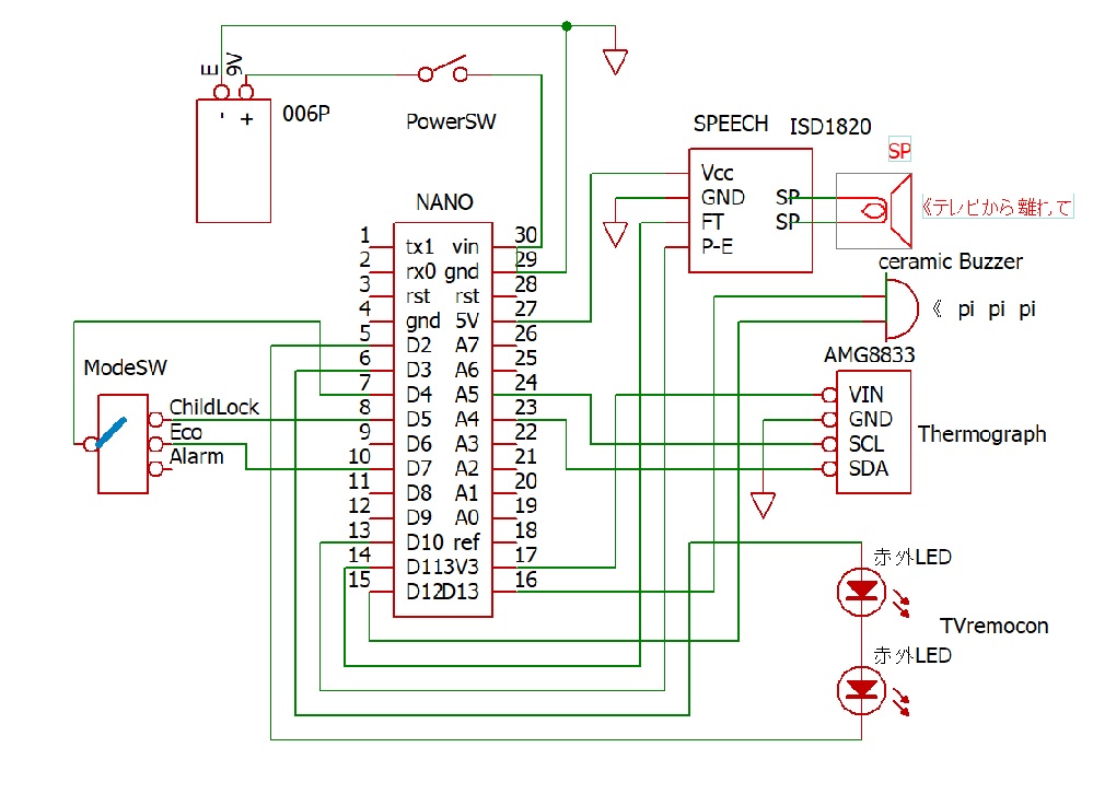 テレビの前にBOXを置き子供が傍に来ると(視野角60度 2~3m)警告音を鳴らし同時に親の声を録音していた音声ボードで”テレビから離れて”を再生。更に1mくらいまで接近すると、長い警告音のあとリモコンで電源OFFする。その後テレビを離れるとリモコンで電源ONする。