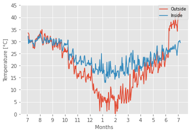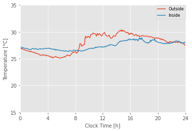 この図を見ると、室内の気温はほぼ変動しておらず、屋外の気温が日中にかけて上昇するのが見て取れます。