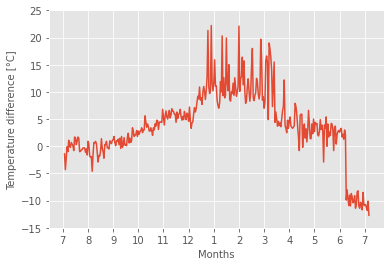 こちらは1年間(2022年7月1日~2023年6月30日)における朝7時の室内外の気温、並びに寒暖差の変動を表しています。
