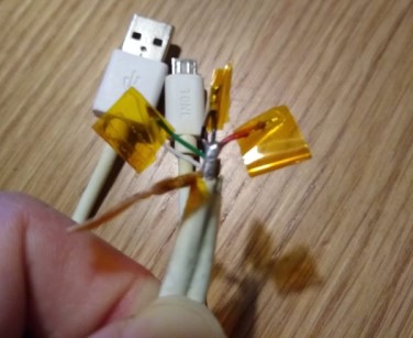 至って簡単で、充電ケーブルのスマホ側、D+とD-を短絡させるだけでOKです。※緑と白の線を短絡させる。その他は同じ色同士接続。