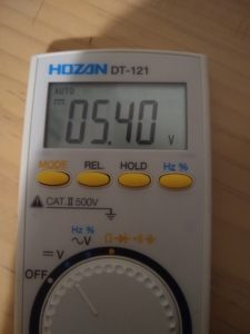 リチウムイオン電池を取りつけた状態でバッテリの電圧が終段のレギュレーター入力に印可されているか、5.4Vで出力されているかの確認。