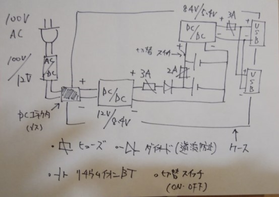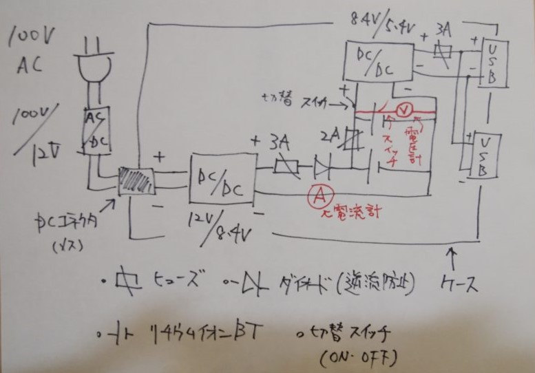 今回は降圧レギュレーターやリチウムイオンバッテリー、FUSE、USBコネクタなど使用していますので、自分なりに分かり易く回路図を作成しました。