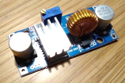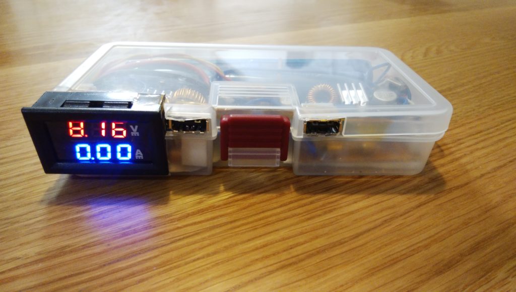 次いで後段のレギュレーターの調節、これはスマホの充電電圧に合わせるので通常であれば5Vに合わせますが、今回は5.4Vにしています。