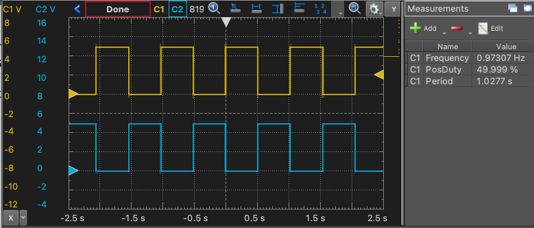 main関数の冒頭部でクロック設定を行う。HFFRQを設定しておかないとクロックが思わぬ値になったりする。NDIVを16にするとクロック周期は16μsだ。OSCTUNEで微調整してはあるが、LED点滅周期は1[Hz]をわずかに超える値になっている(上図参照)。