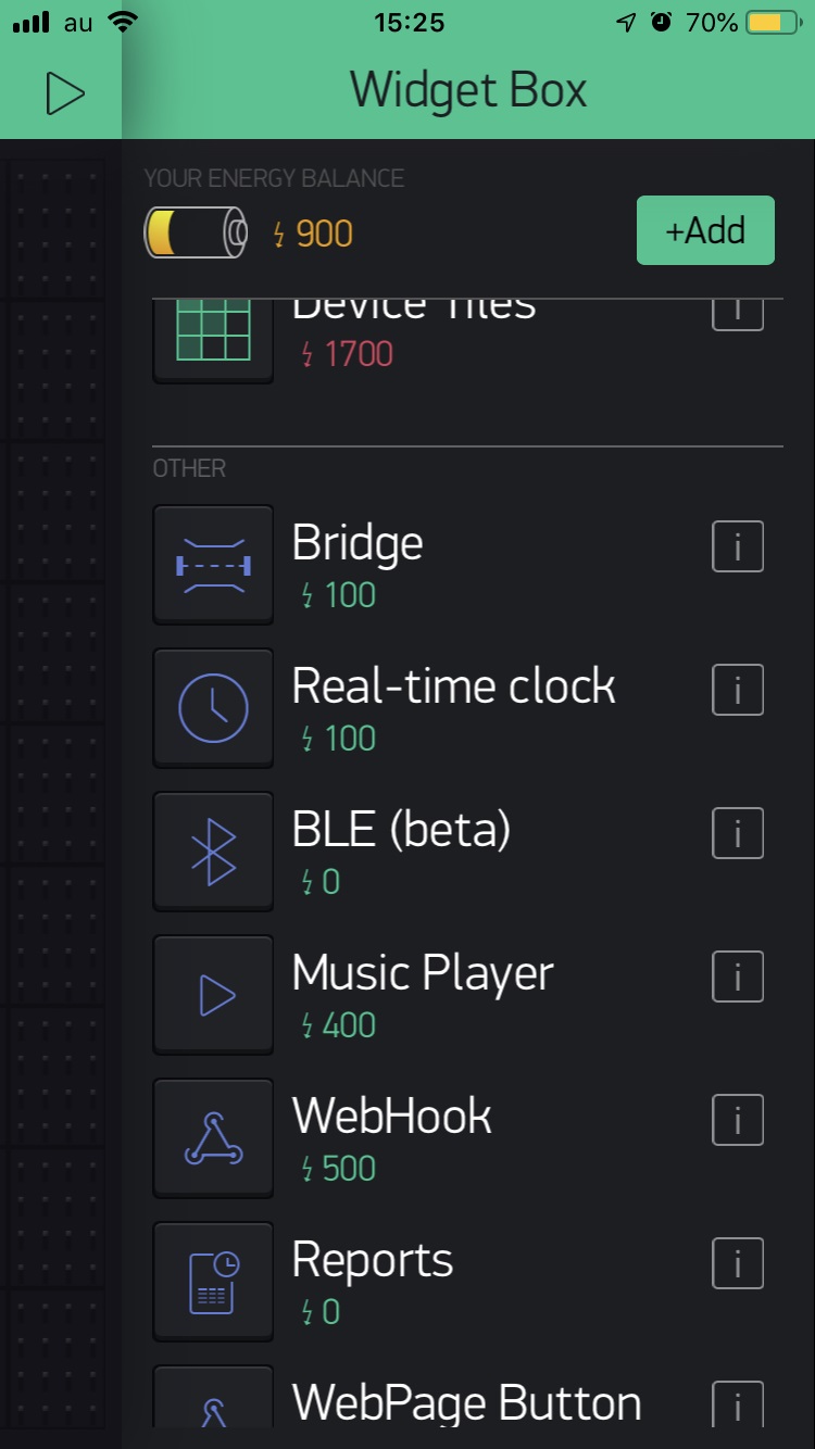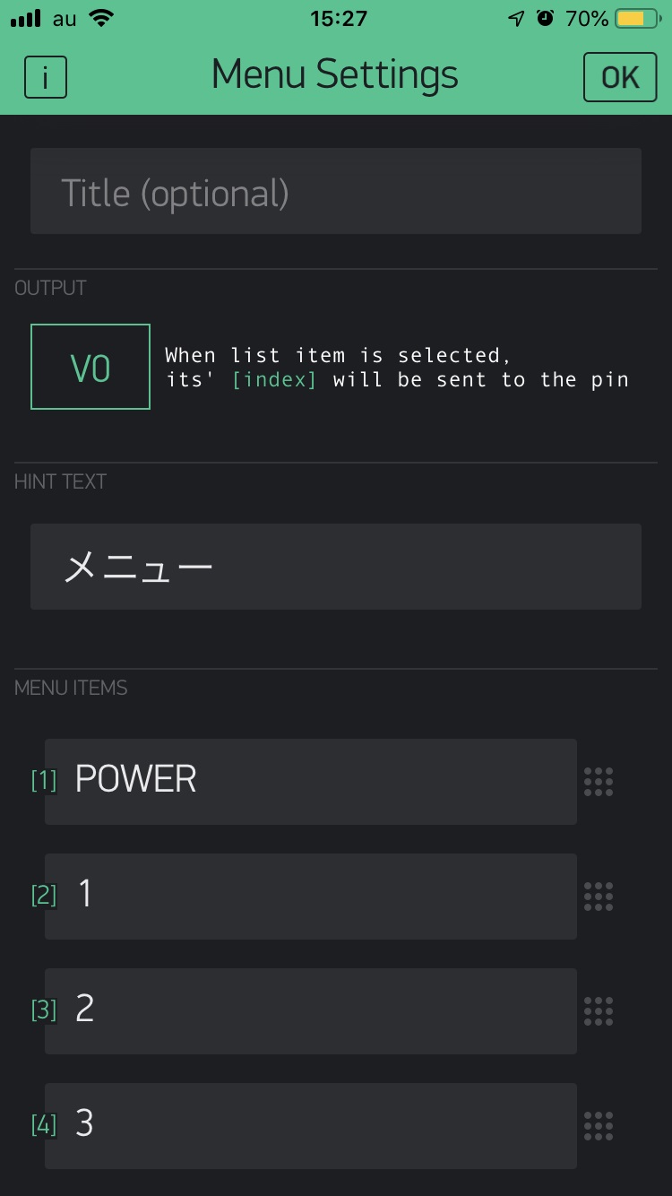 各種Widgetの値を受け取るには置いたWidgetをタップして開かれたSettingsのOUTPUTにバーチャルピンを指定する必要があります。