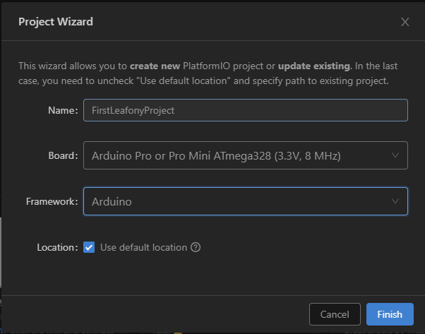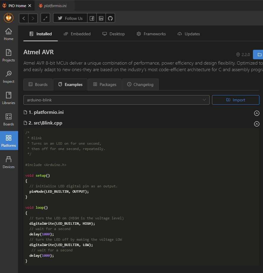 PIO Home > Platforms > Atmel AVR にサンプルの記載があるのでこれをそのまま main.cpp にコピペしてビルドすると問題なく動きました。