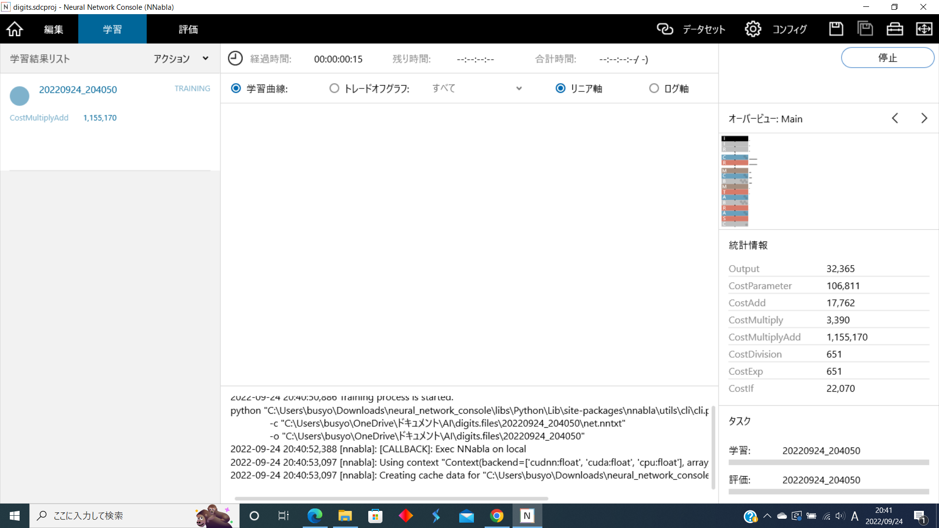 左上の学習をクリックして右上の学習を確認して実行をクリックすると、機械学習が始まります