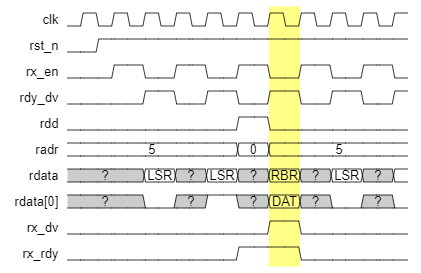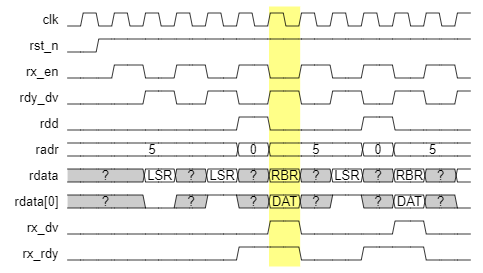上記のタイミングチャートは、3 クロック目の後付近(rdata[0] が 1 になる少し前)に 1 バイトの受信が行われたという想定で描いています。1 バイト受信されると LSR.RxRDY が 1 になるため、rdata[0] が 0→1 に変化します。すると、その後 rdd が 1 になり、その影響で radr が 0 になるため、RBR からデータが読み出される、という仕組みです。RBR からデータが読み出されると LSR.RxRDY は 0 に戻ります(と理解しているのですが、間違っていたらご指摘ください)。